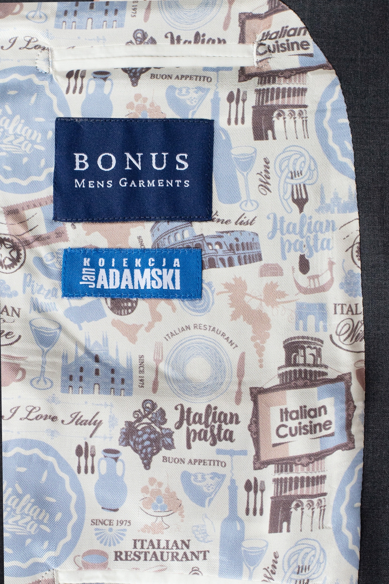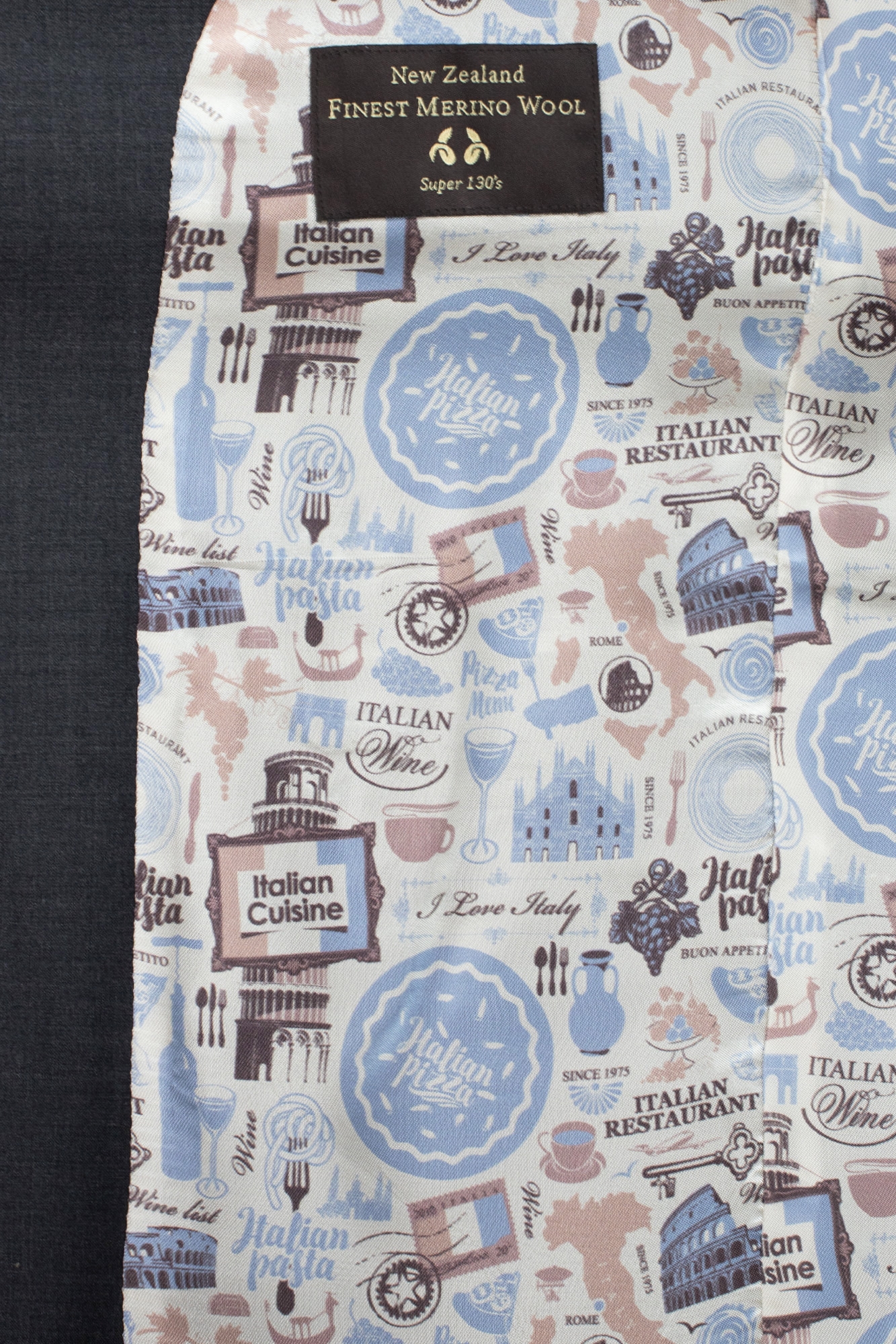 IVAN jest uszyty z wełny merino (czyli z wełny pochodzącej z owiec gatunku merynos) super 130’s. Wełna ta charakteryzuje się bardzo cienkimi i sprężystymi włóknami i jest bardzo ceniona za oddychalność, elastyczność i odporność na zagniecenia. Ma też niezrównaną zdolność termoregulacji – zwykło się o niej mówić, że jak trzeba grzać to grzeje a jak trzeba chłodzić to chłodzi. W dziele termoregulacji dobrze współpracuje z oddychającą podszewką z wiskozy. Podszewka jest wzorzysta co nadaje marynarce bardzo indywidualnego sznytu.