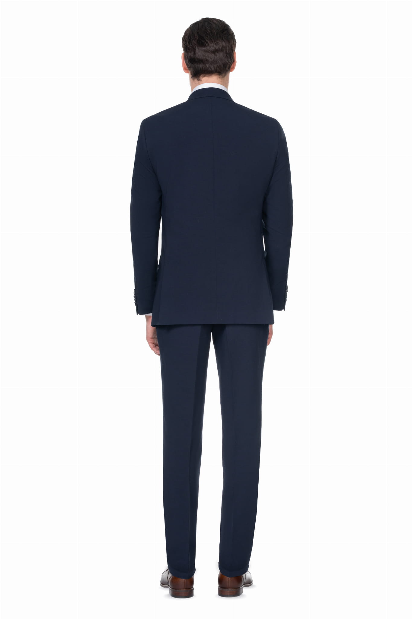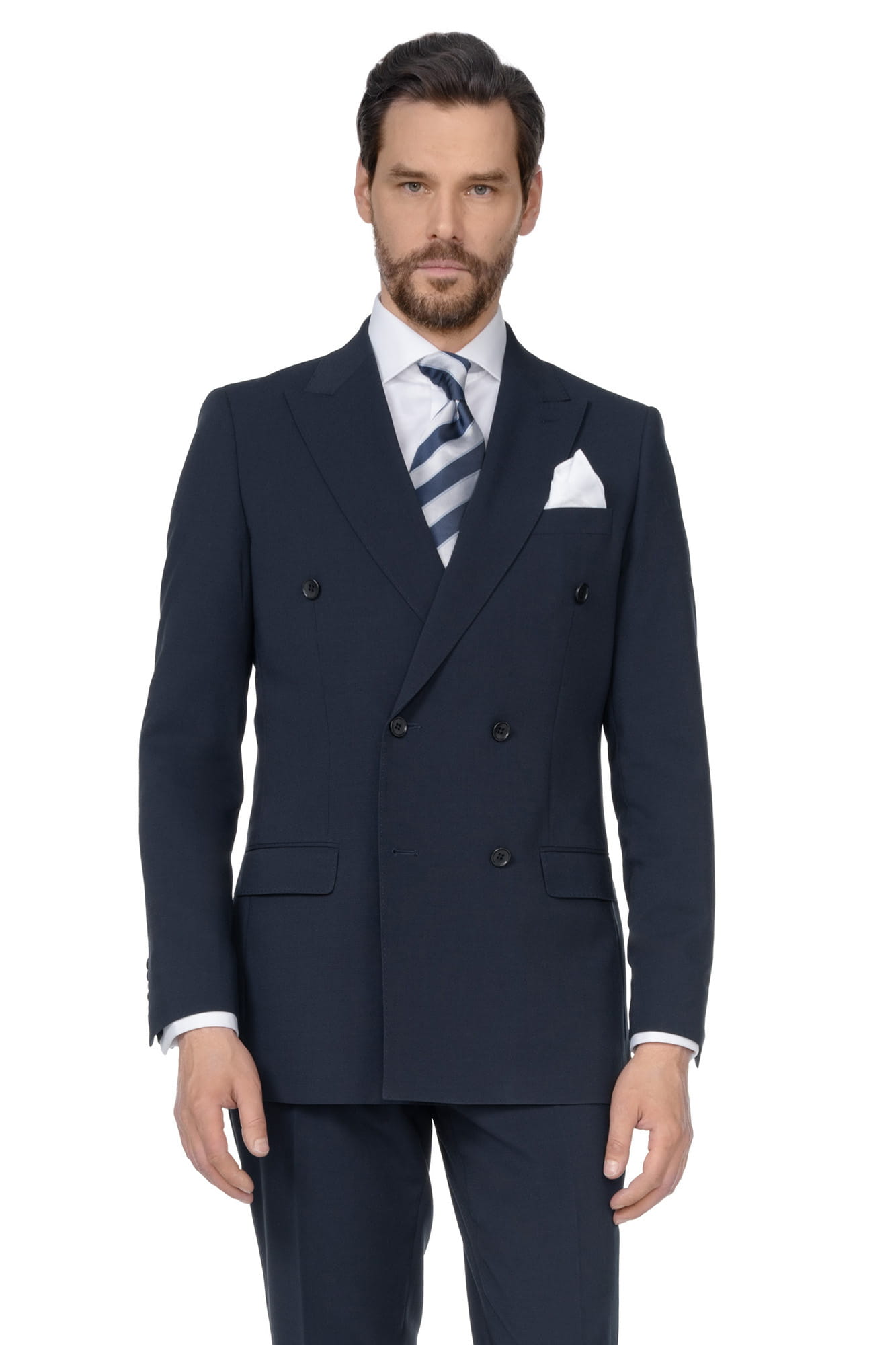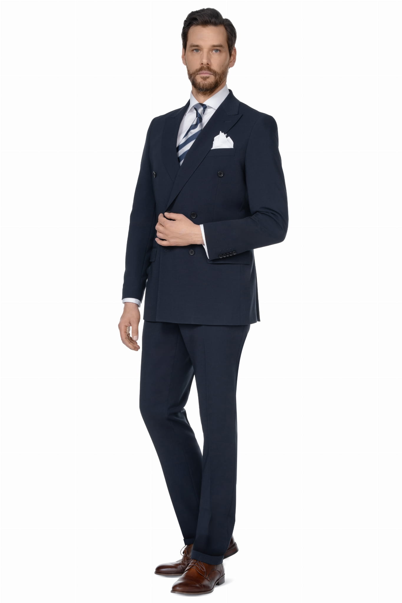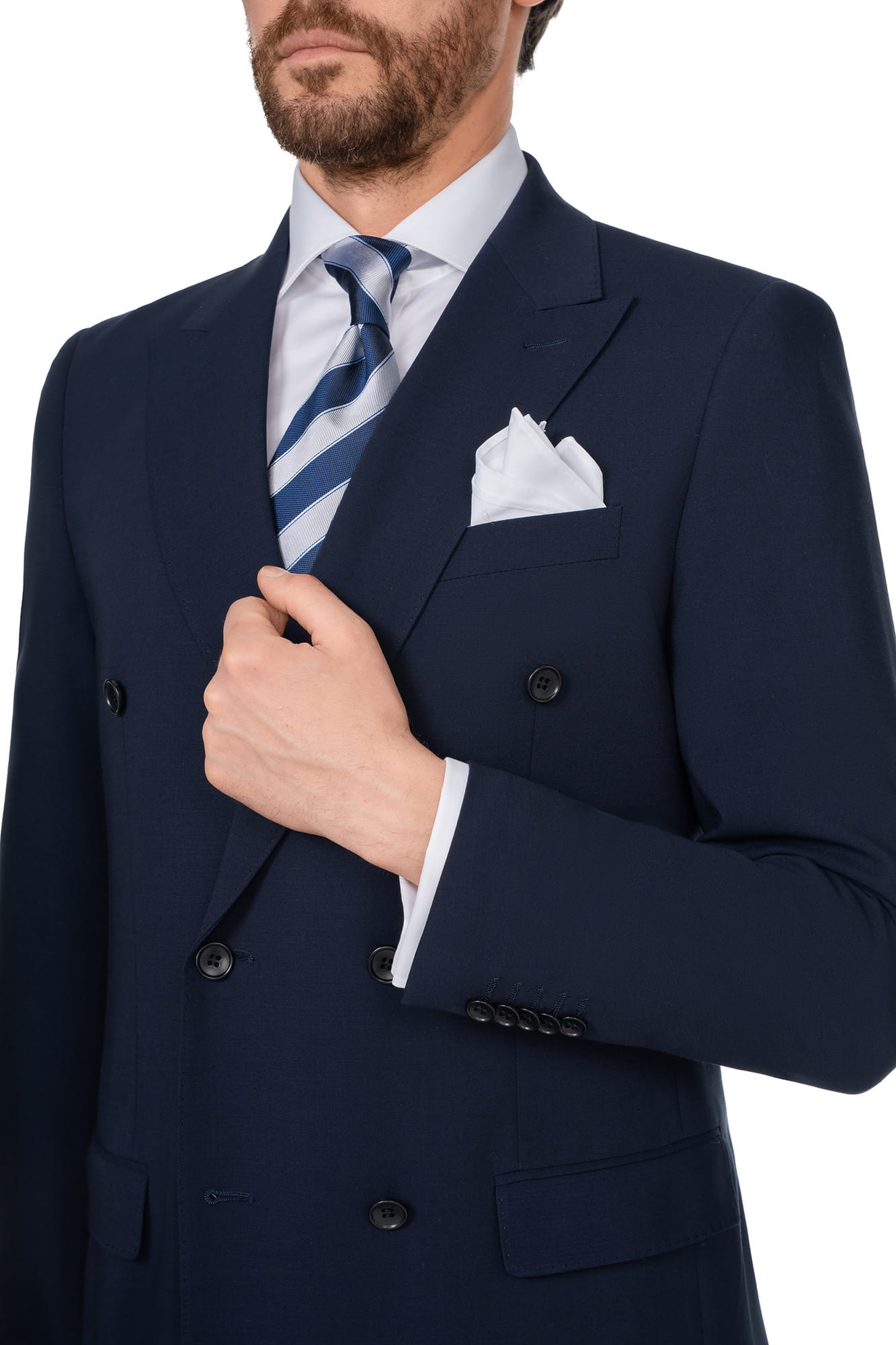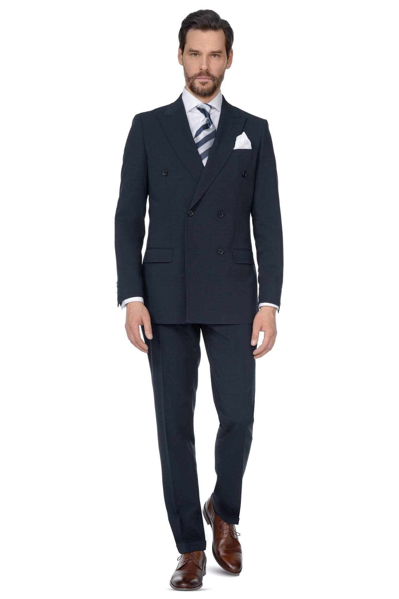 Klasyczny granatowy garnitur dwurzędowy. Marynarka o dwurzędowym zapięciu z układem guzików 6 x 2 (6 guzików, 2 zapinane).